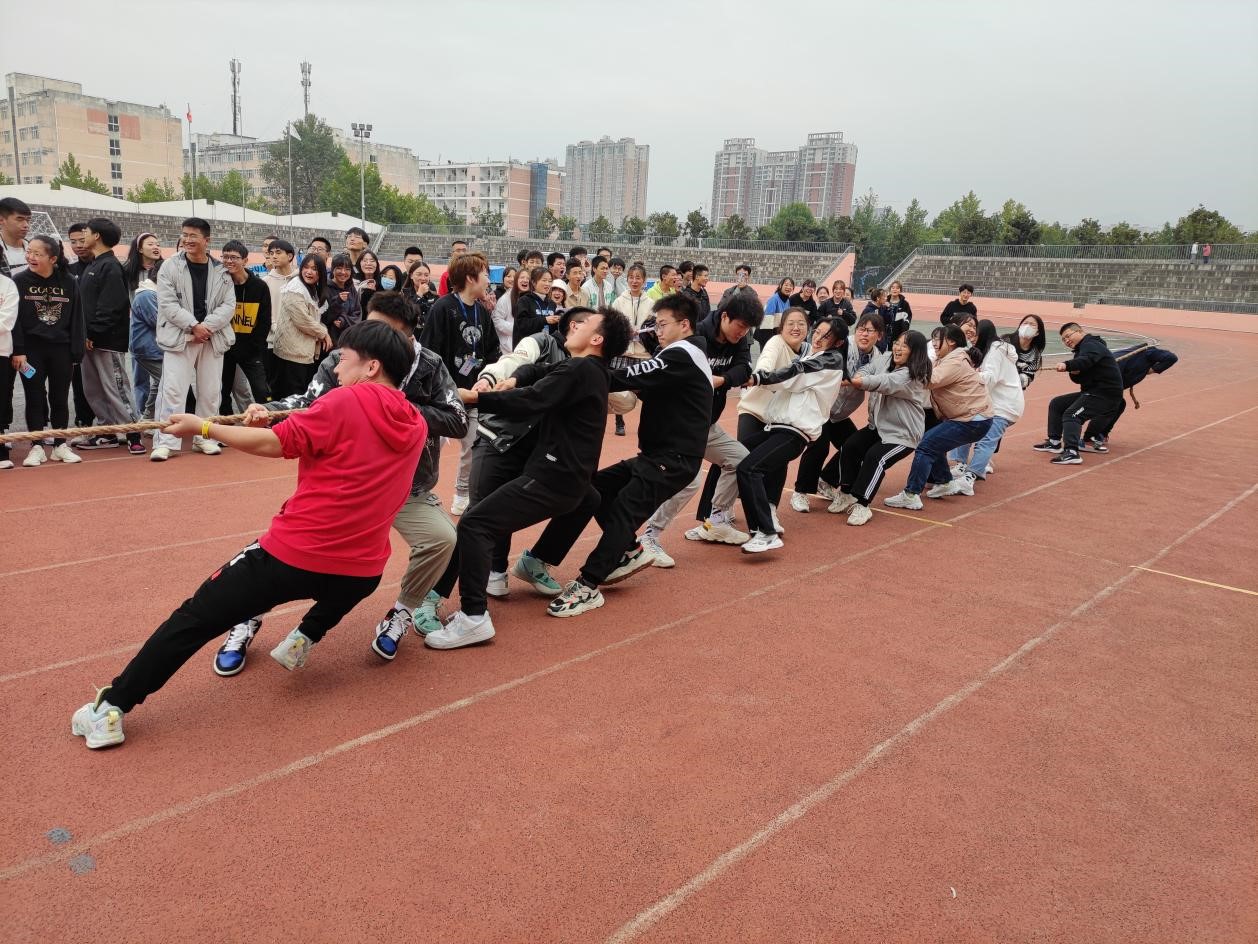 其次是考验团队计策以及配合程度的拔河,各队队员摆好应战姿势,哨声一响同时喊起“一二一二”的口号,与场下同学的欢呼声一起将比赛气氛推向高潮。