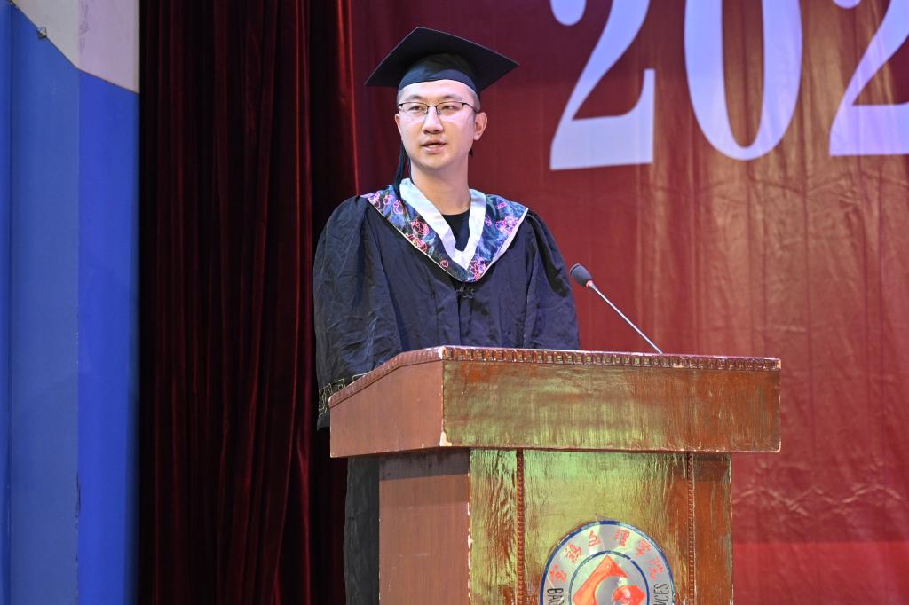 刘淳安代表学院向2023届顺利完成学业的全体毕业生表示热烈祝贺,向为同学们的成长成才付出辛勤劳动的老师们表示衷心感谢,向含辛茹苦养育和支持同学们完成学业的家人们致以崇高敬意。他充分肯定了同学们在校期间的努力与取得的成绩,感谢同学们为学院和学校发展作出的重要贡献。他向同学们提出了三点希望:一是加强品德修养,做一个德才兼备的人。人的品德是人生道路上不断进取的不竭动力。有了良好的品德,人生的脚步才能走得更稳健、更长远。二是养成终身学习的良好习惯,做一个有益社会的人。学习不会在离开校园后停止,而是将伴随我们终生。大学毕业,步入社会,同学们的事业才刚刚起步。要成为一个能为社会做出贡献之人,要成为人生道路上真正的强者,就必须不求近功,不安小就,与时俱进,终生学习。三是要开拓创新,努力成为工作岗位上的创造者、开拓者和引领者。大学四年同学们一直在努力培养自我创新、创业精神。在走上工作岗位后希望同学们能够认真自觉去实践这种精神。要有敢于面对事业初期艰难和困苦的勇气,要有充满对事业开拓创新的自信和干劲,要有不断超越前人的胆识和斗志,努力实现自己的人生目标。
