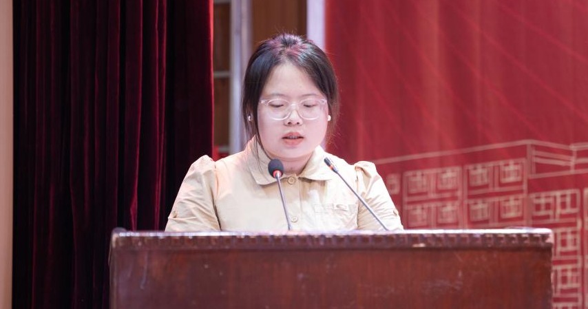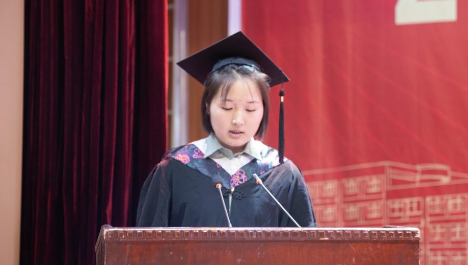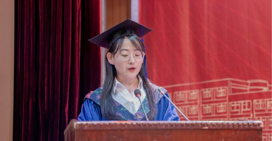 2021级学硕1班白朵同学代表学院硕士毕业生向辛勤培育她们的各位领导和导师们致以最崇高的敬意和真挚的感谢,她回顾了三年硕士研究生学习经历中的宝贵收获,她表示在新的起点上将继续保持学习的热情和求知的欲望,同时祝愿母校再书华章,祝愿老师们身体健康,桃李满天下!