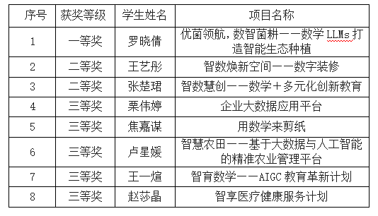 本次活动要求学生以“数学+”的形式调研构思完成创新创业项目计划书,重点考查学生对“数学学科”的理解,考验其市场敏感性,重点是要找到数学与实际的契合点,并以创新的方式满足市场需求。最后,专家小组从项目背景、产品服务与项目具体实施说明、项目优势、社会价值及前景等内容上对学生提交的30余个项目书进行评阅,确定了一等奖1名,二等奖2名,三等奖5名,结果如下: