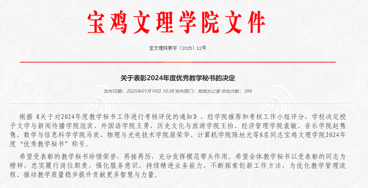 1月19日,根据《关于对2024年度教学秘书工作进行考核评优的通知》,经学院推荐和考核工作小组评分,我院马欢老师荣获太阳成集团tyc122cc入口2024年度“优秀教学秘书”称号。