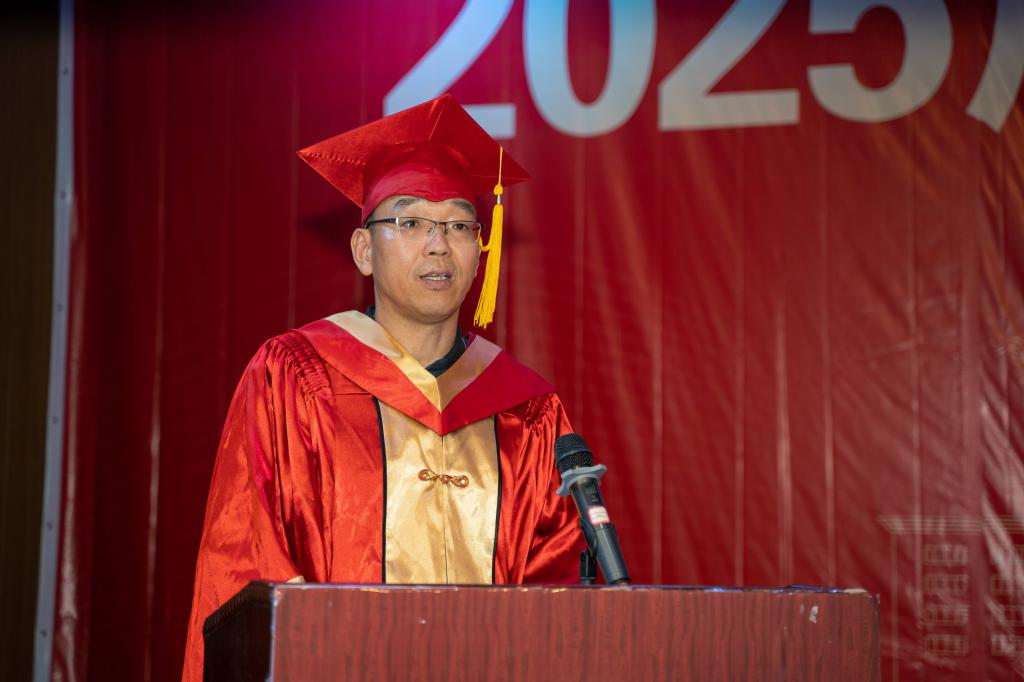 刘淳安代表学院向2025届顺利完成学业的全体毕业生表示热烈祝贺,向为同学们的成长成才付出辛勤劳动的老师们表示衷心感谢,向含辛茹苦养育和支持同学们完成学业的家人们致以崇高敬意。他充分肯定了同学们在校期间的努力与取得的成绩,感谢同学们为学校和学院发展作出的重要贡献。他向同学们提出了四点希望:一是要志存高远,勇于担当。同学们随着知识的积累和能力的增强,身上更多了一份对国家、民族、社会的责任与担当;二是要脚踏实地,善于思考。毕业后同学们要从零开始,不能好高骛远,要耐得住寂寞,老老实实做人,踏踏实实做事;三是要不忘初心,克服浮躁。同学们走出自由宽松的大学校园,走上纷繁复杂的社会,要克服浮躁,不忘初心;四是要终身学习,博采众长。毕业不是学习的终结,而是新的学习阶段的开始。同学们走上工作岗位之后,要积极主动地适应社会,不断完善自我,取得更大的成功。