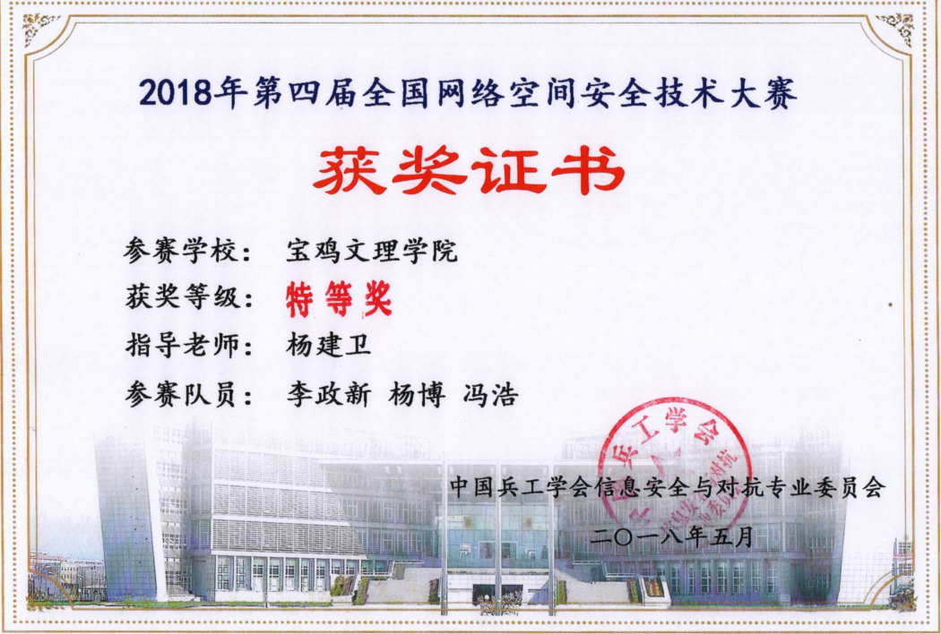 我院学生 杨博 作为参赛队员参加2018年第四届全国网络空间安全技术大赛,获得特等奖。